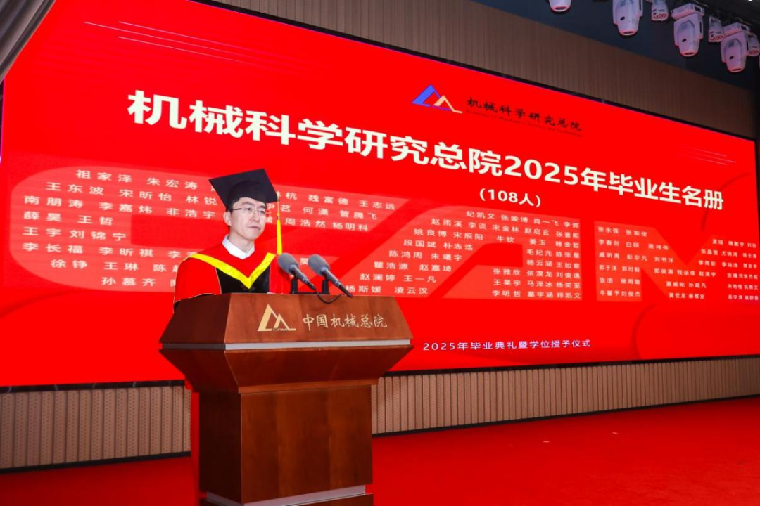 機(jī)械總院學(xué)位評(píng)定委員會(huì)主席、集團(tuán)黨委書(shū)記、董事長(zhǎng)王德成,集團(tuán)黨委副書(shū)記、總經(jīng)理孟祥宇,集團(tuán)黨委副書(shū)記、董事李玉鑫,集團(tuán)黨委委員、副總經(jīng)理王宇,機(jī)械總院學(xué)位評(píng)定委員會(huì)副主席、集團(tuán)副總經(jīng)理李愛(ài)國(guó),集團(tuán)副總經(jīng)理姜超出席典禮,機(jī)械總院學(xué)位評(píng)定委員會(huì)委員、京內(nèi)外各二級(jí)單位領(lǐng)導(dǎo)、導(dǎo)師代表、研究生管理部門(mén)負(fù)責(zé)人、2025屆畢業(yè)生及家屬共計(jì)190余人齊聚一堂,共同見(jiàn)證這一重要時(shí)刻。典禮由機(jī)械總院學(xué)位評(píng)定委員會(huì)秘書(shū)長(zhǎng)、研究生院副院長(zhǎng)邊翊主持。